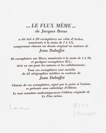 Un des 20 exemplaires de tête sur vélin d’Arches numéroté II/XX et signé au crayon par Jean Dubuffet et par le poète Jacques Berne (1924-2007).